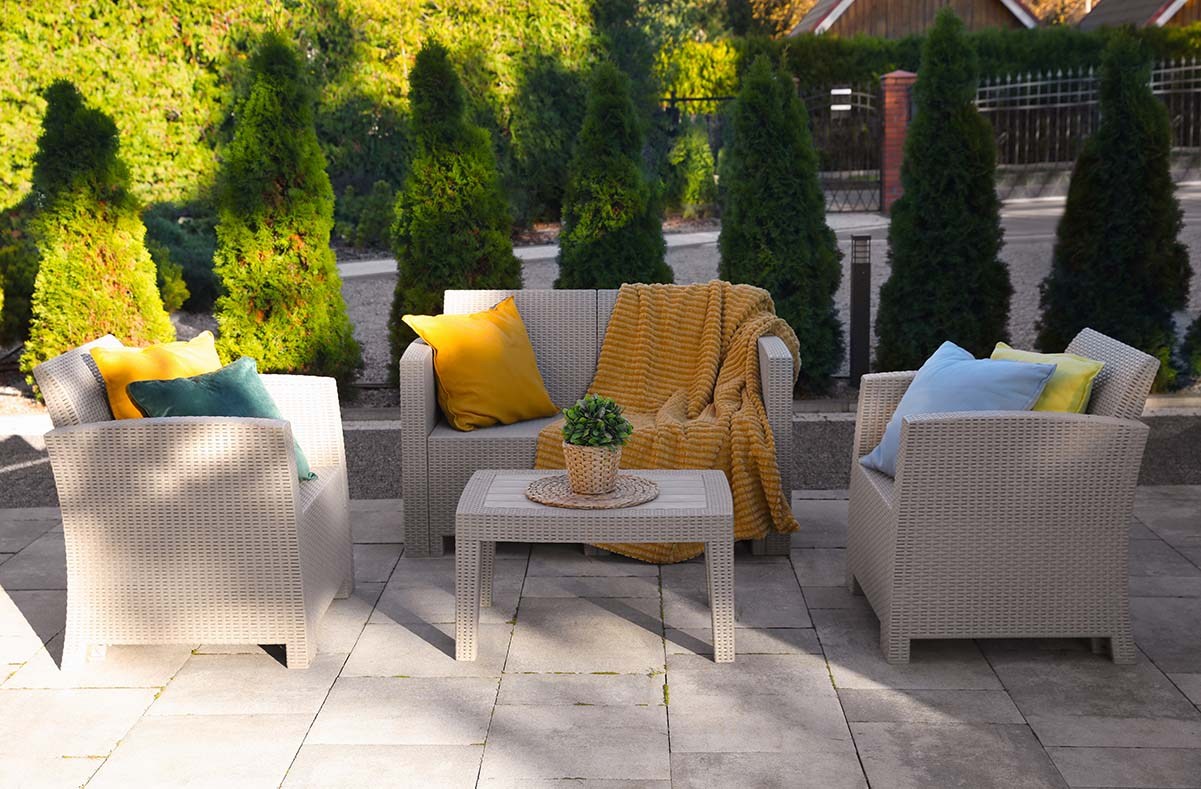 Hampton Bay's beautiful outdoor furniture set comes with everything you need to turn your backyard into an extended living space for parties or just relaxing. The all-weather wicker holds up in any outdoor conditions while the cushions are coated to be resistant to liquid, stains and fading.