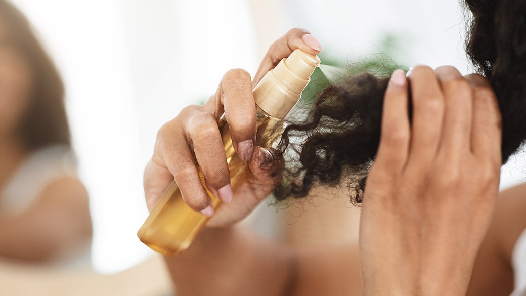If you prefer to style your hair with hot tools, invest in a quality heat protectant spray to protect your locks from the damage of direct heat from curling irons, blow dryers and flat irons. Before applying direct heat to your hair, spray the protectant from the middle to the ends of your hair. Once styled, the product shouldn’t leave any heavy residue on your hair.