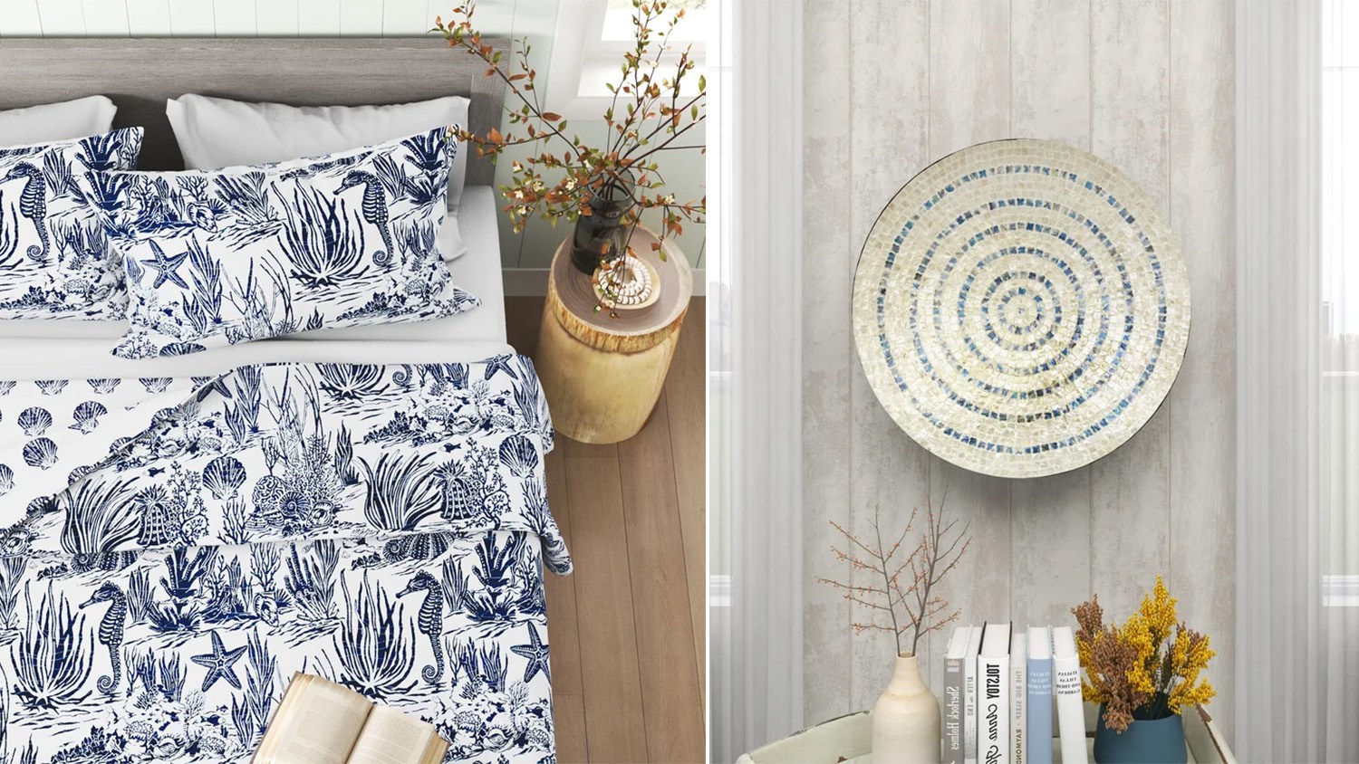 If the bedroom is the area you are targeting for a coastal motif upgrade, this blue-and-white cotton quilt set will satisfy. It comes with a quilt and shams, and it features two original designs. On one side, the set has an underwater coral reef scene, while the other features a seashell pattern.