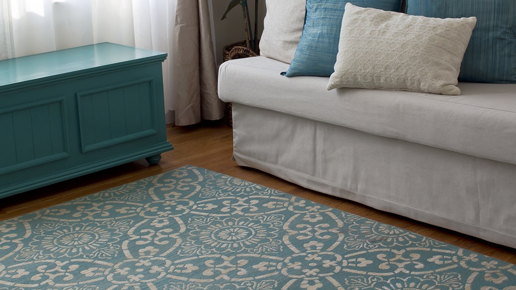 Next, you’ll want to think about what kind of rug you want: patterned or solid? A patterned rug has lots of versatility; it adds other colors or reduces the overall amount of teal in the design so you can tone down the degree to which you’re accenting. Solid teal makes much more of a statement, so you’ll want to introduce other patterns and motifs around it.