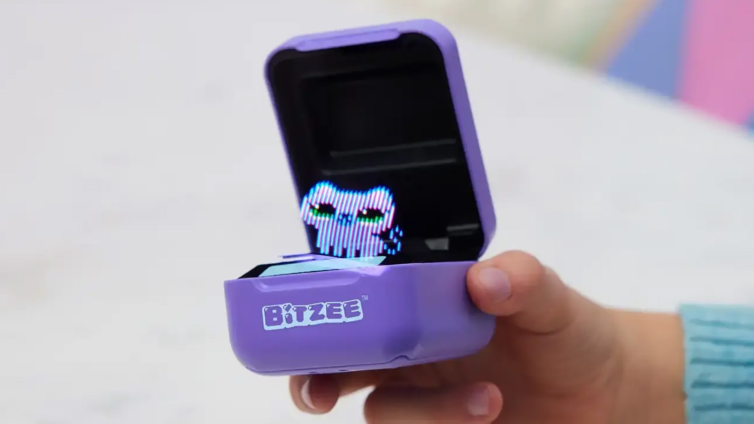 A Bitzee is a virtual pet toy by Spin Master. It comes in a purple clam shell case that kids can open up to reveal a 3-D, holographic pet that appears to float in midair. The display is made of a thin strip of strobing, color-changing LED lights that create the illusion of a hologram.