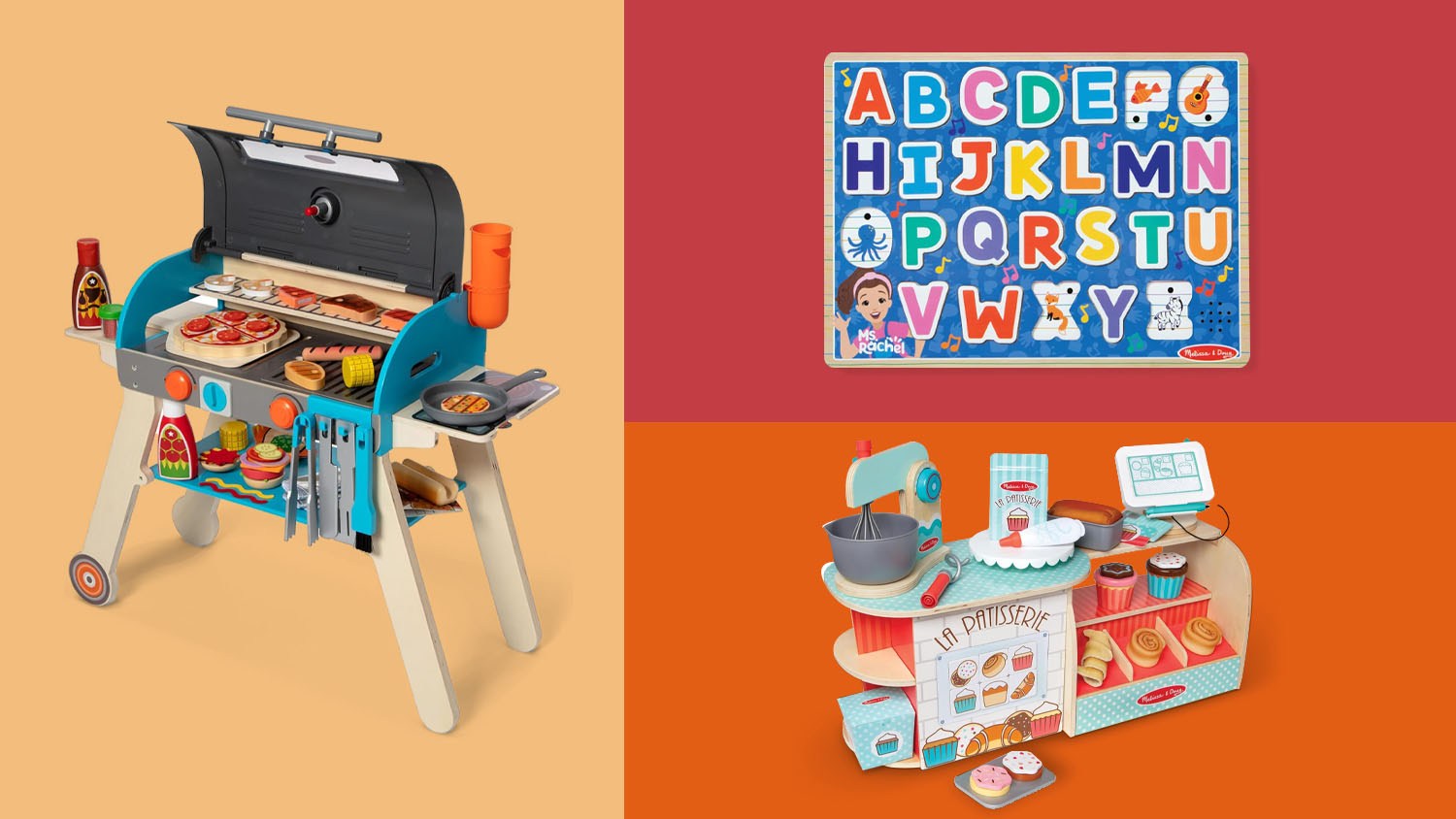 In this article: Melissa & Doug Wooden La Patisserie Bakery, Melissa & Doug Ms. Rachel Wooden Phonics Alphabet Sound Puzzle and Melissa & Doug Deluxe Wooden Barbecue Grill, Smoker & Pizza Oven